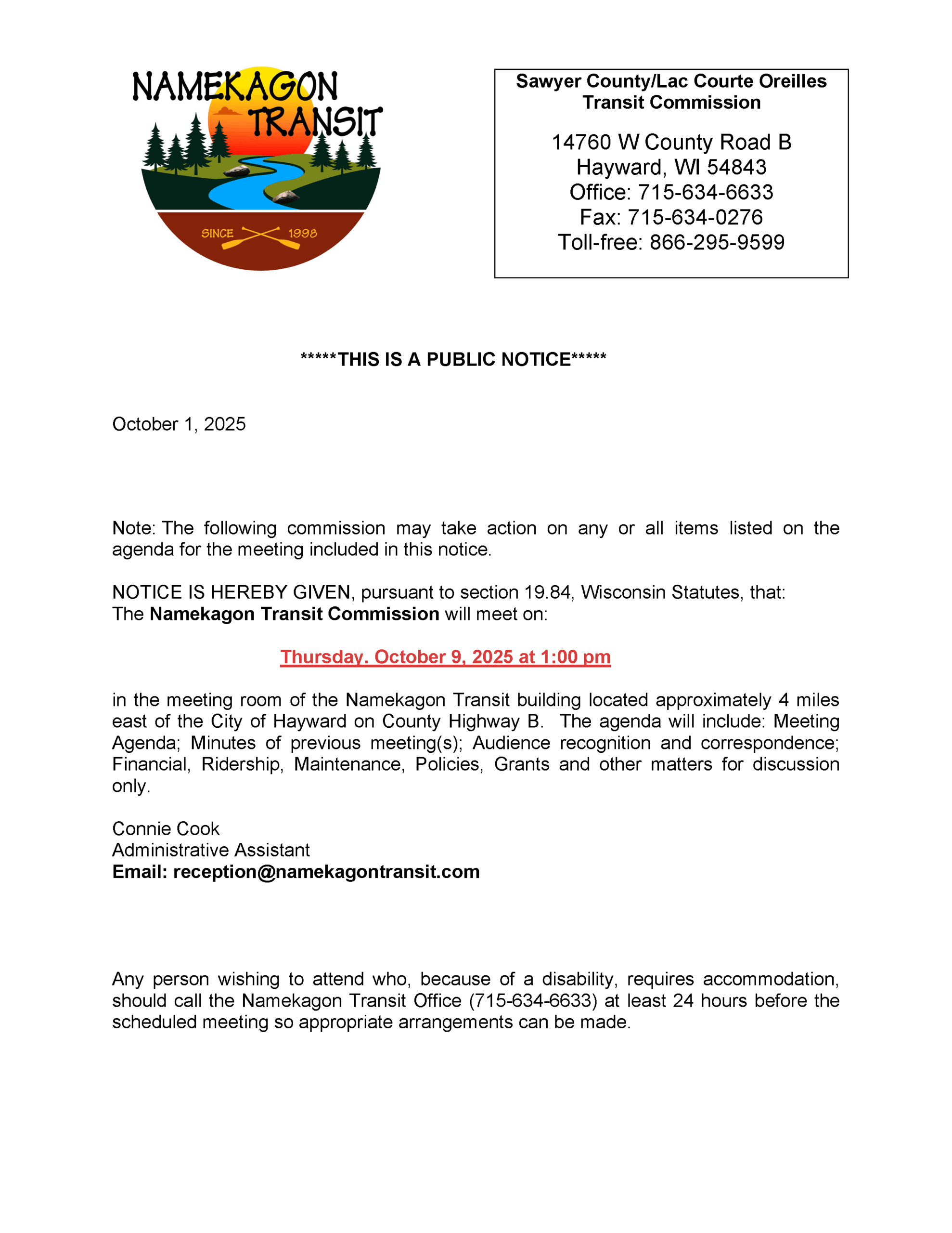 The Sawyer County/Lac Courte Oreilles Commission Board meets once a month on the Second Thursday at 1 p.m. in the Board Room at Namekagon Transit. All Board meetings are open to the public.