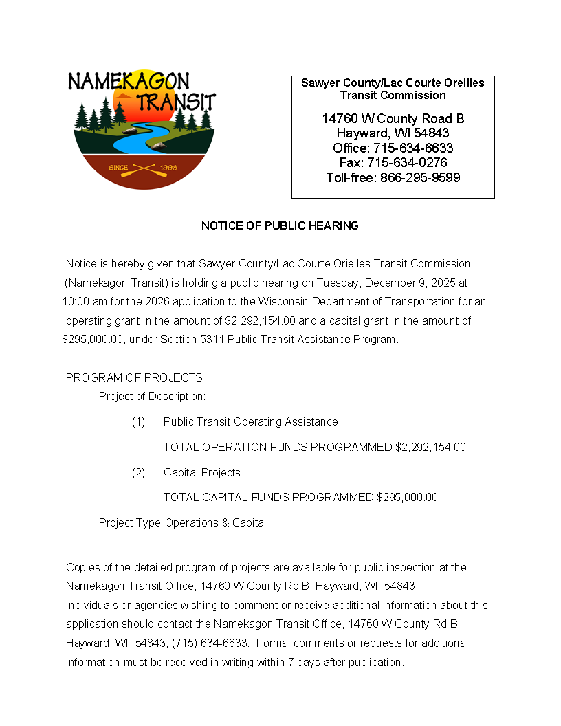 Purpose:  To provide, preserve, promote, plan, assist, finance, acquire, operate, maintain and enhance existing and future transportation systems in Sawyer County, Wisconsin and the Lac Courte Oreilles Reservation.