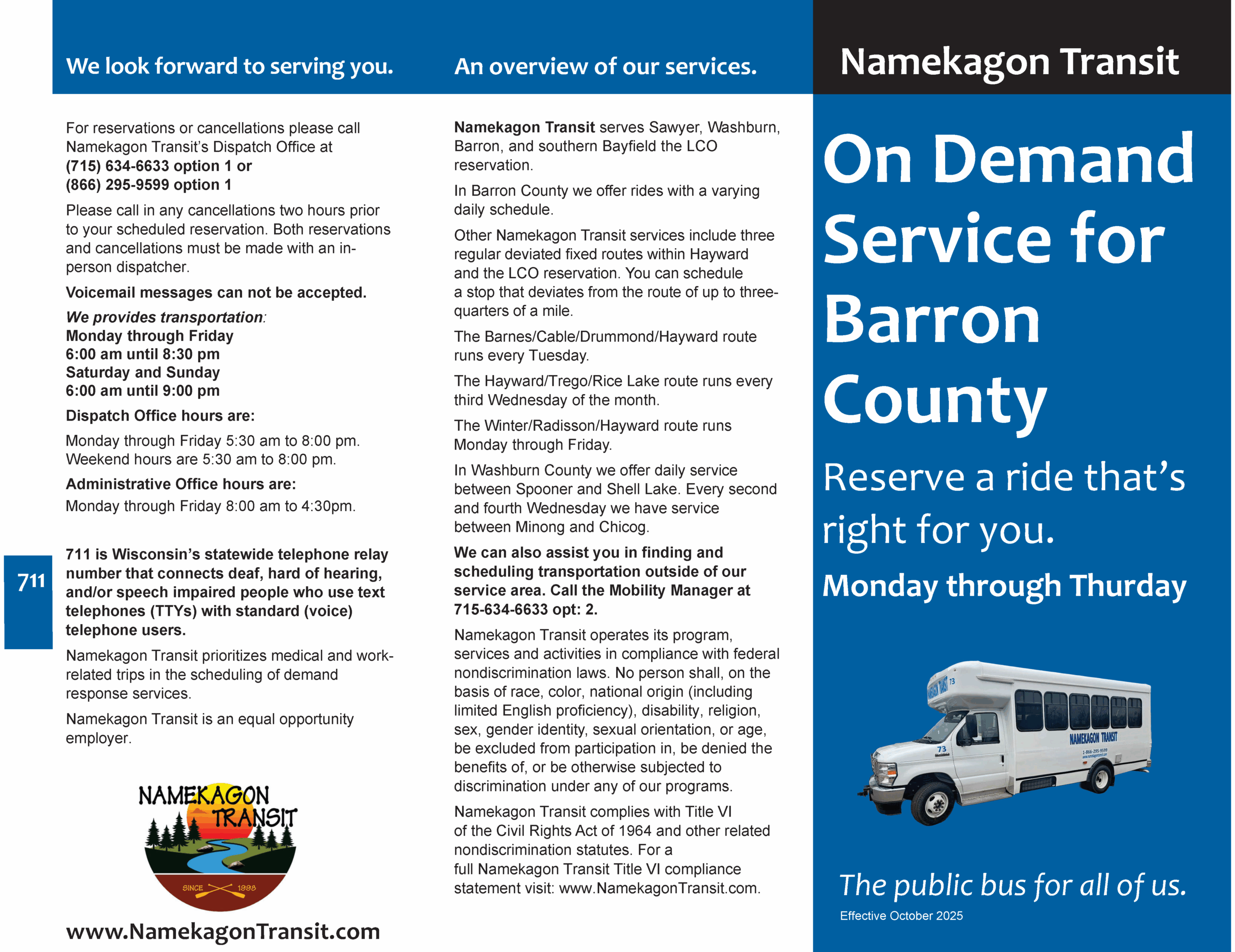 Namekagon Transit also provides service from Hayward to Trego to Spooner to Rice Lake every 3rd Wednesday of the month.